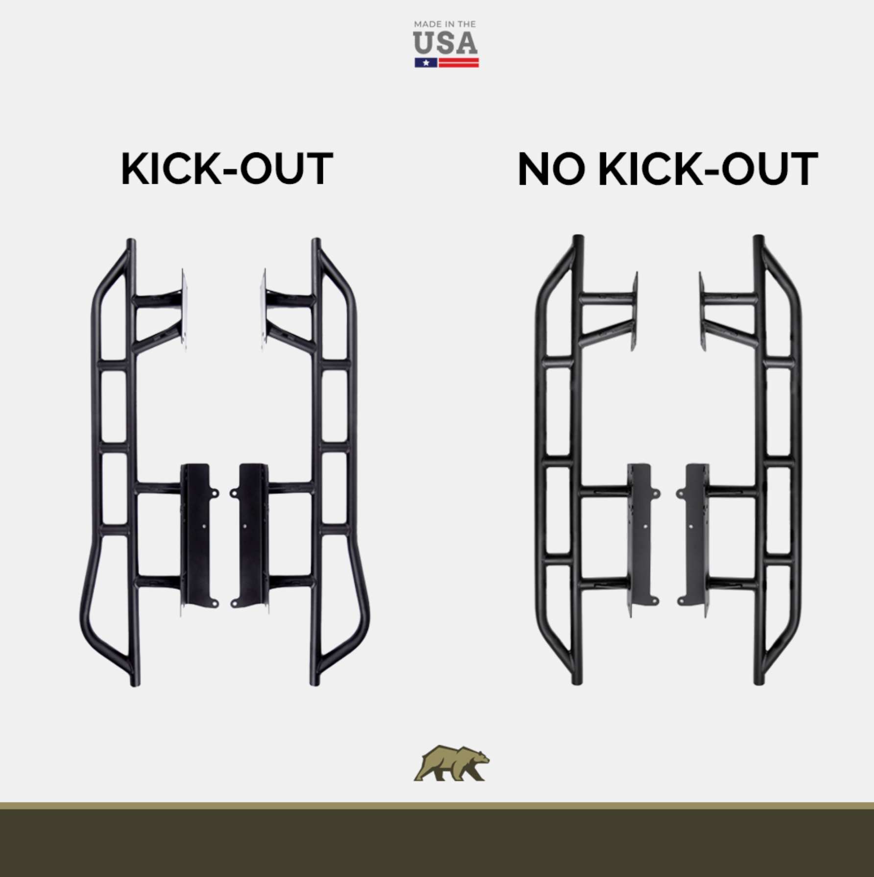 Choose between kick-out or no-kick-out, from RAW, Powder Coat, and Bedliner finishes. You can even mix and match the slider and filler plate finishes! More options than any other supplier on the market! Crafted from American 2.0" DOM tubing, we don't up-charge you for better material or for features like kick-outs.